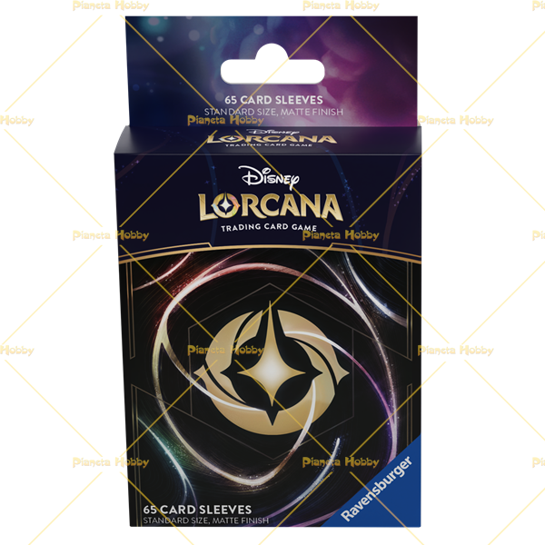 Proteggi le carte dall'usura del gioco con le bustine protettive decorate con l'illustrazione del Logo di Lorcana. La confezione include 65 bustine protettive con finitura opaca.