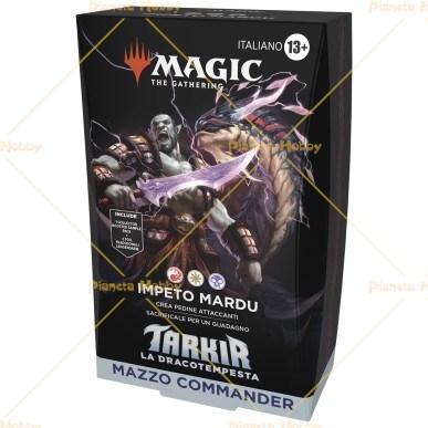 Mazzo da Commander rosso-bianco-nero dell'espansione Tarkir: La Dracotempesta. All'interno troviamo: - 100 Carte per mazzo, di cui 2 leggendarie foil tradizionali - 10 pedine bifronte in ciascun mazzo - Collector Sample Pack in ciascun mazzo: ciascuno contiene 2 carte con bordo alternativo - Una carta guida e un portamazzo in ogni Commander