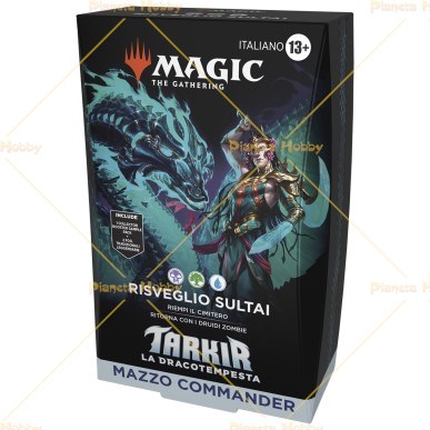 Mazzo da Commander nero-verde-blu dell'espansione Tarkir: La Dracotempesta All'interno troviamo: - 100 Carte per mazzo, di cui 2 leggendarie foil tradizionali - 10 pedine bifronte in ciascun mazzo - Collector Sample Pack in ciascun mazzo: ciascuno contiene 2 carte con bordo alternativo - Una carta guida e un portamazzo in ogni Commander