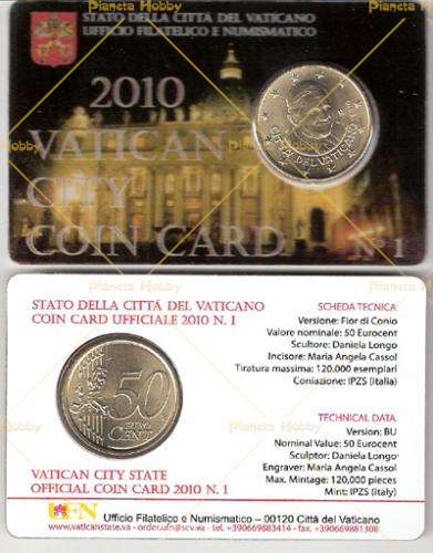 Prima emissione di una coin card del Vaticano contenente la moneta da 50 cent. millesimo 2010 - Tiratura 120.000 esemplari