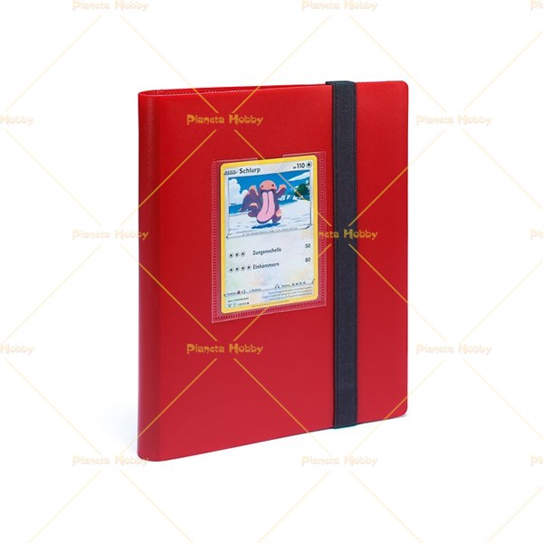 Album flessibile con banda elastica, che può contenere un massimo di 160 carte collezionabili, i fogli sono a 4 tasche e sono già compresi. Davanti vi è una finestrella in cui poter inserire una carta di dimensione STANDARD.