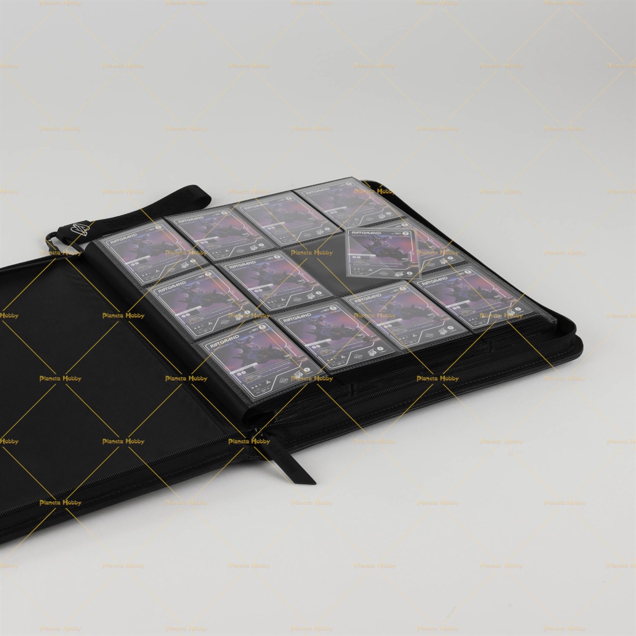 ZipBinder480 con 20 fogli a 12 tasche (per un totale di 480 tasche per carte), All'interno incluso 1 Laccio 2Hook nero incluso utilizzabile per la personalizzazione del raccoglitore. Il binder è compatibile con il sistema 2Hook per la personalizzazione a colori per distingure i raccoglitori. Grazie alla cerniera in silicone con logo a rilievo e struttura rinforzata, il tuo setup è tanto stabile quanto bello ed impatto esteticamente. Confezionato in una scatola di cartone.