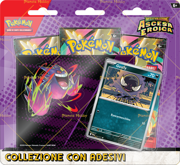 La collezione con adesivi dell'espansione Megaevoluzione - Ascesa Eroica del GCC Pokémon contiene: