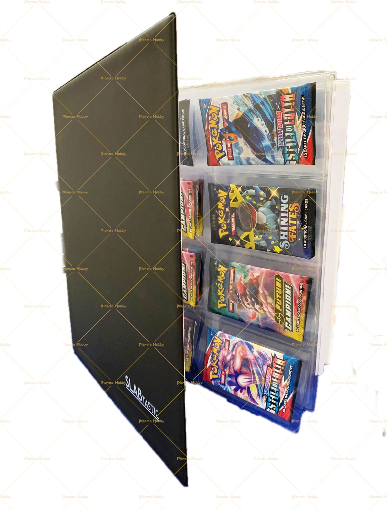Ogni foglio ha 8 spazi per inserire i pacchetti di ogni tipo di gioco di carte collezionabile (Pokemon,Magic, Yu-gi-Oh, ecc..) in modo semplice e comodo.