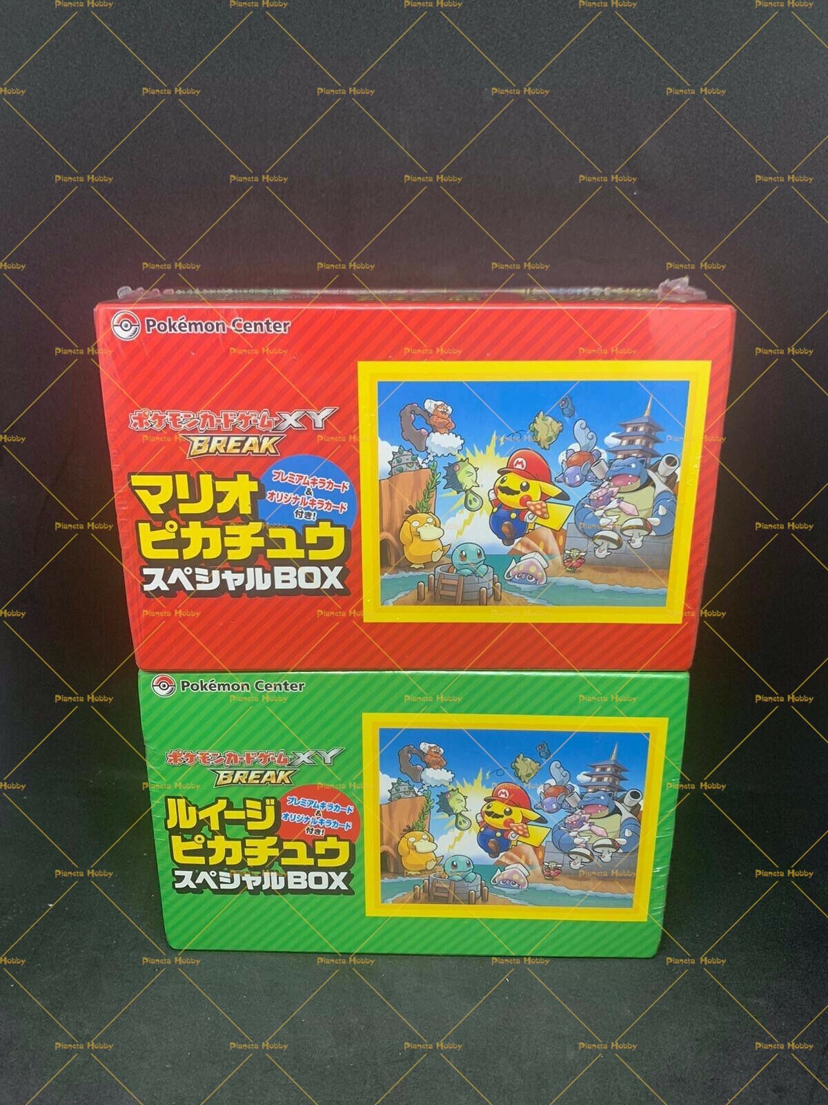 Coppia delle Special Box Mario e Luigi Pikachu ! Sigillate e mai aperte. Distribuite e acquistabili solo per un breve periodo nel 2016 presso i Pokemon Center in Giappone. All'interno bustine protettive (Mario e Luigi), deck box (Mario e Luigi) e 4 carte promo esclusive di cui 2 Full Art e 2 olografiche.
