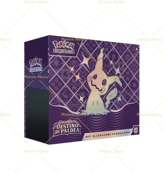 All'interno del Set Allenatore Destino di Paldea troviamo: - 9 Buste da 10 Carte ciascuna dall'espansione Scarlatto & Violetto: Destino di Paldea - 1 Carta promo e 65 bustine protettive di Mimikyu - 45 carte Energia, 6 dadi segnalini danno, un dado lancia-moneta e due segnalini condizioni
