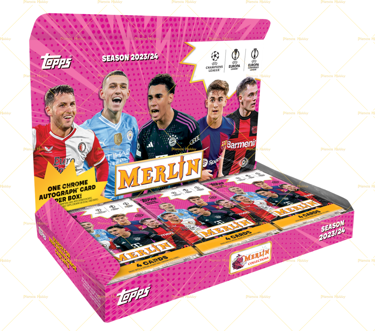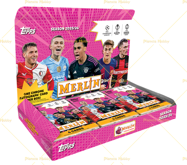 Box con 18 pacchetti per box ,4 carte per pacchetto. 1 autografo “Chrome” per box! Merlin UEFA Club Competitions 2023/24 presenta nuovi entusiasmanti “Rookies” e superstar in un set base di 150 carte. Scopri le rare “Rookie Variations”, dai la caccia ai nuovi e iconici design come Mystic Nights, Merlin’s Chosen One, Ageless Alchemy e le fantastiche case hit Renaissance e Merlin’s Match Ball Signatures. Cerca, inoltre, le rarissime Sword Cards e Merlin’s Match Ball Signatures Jumbo Book Card! Per la Checklist della collezione CLICCA QUI